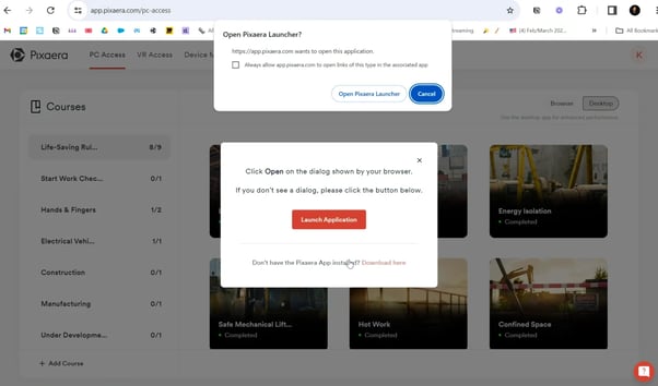 - Your browser will ask for permission to launch the Pixaera Launcher — click ‘Open’ or ‘Launch Application’ if prompted.