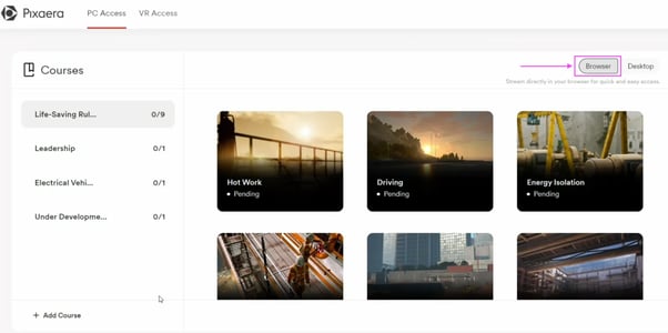 - From the “Training” tab in your Pixaera dashboard, set the toggle to ‘Browser’ and click on a training module you’re taking.