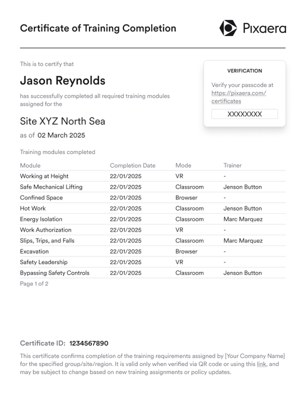 Contractors can complete training on their own schedule — before arriving on site — making onboarding asynchronous and more efficient. - Automatic certificate issuance