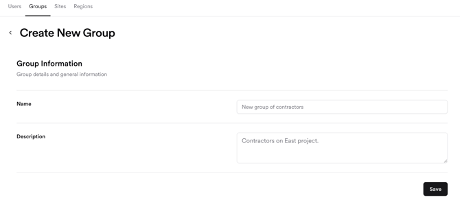 - Input the Group/Site/Region information (Name and Description) and click 'Save'