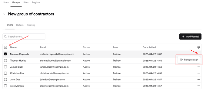After you've added users, you can remove them from the Group/Site/Region individually or in bulk.