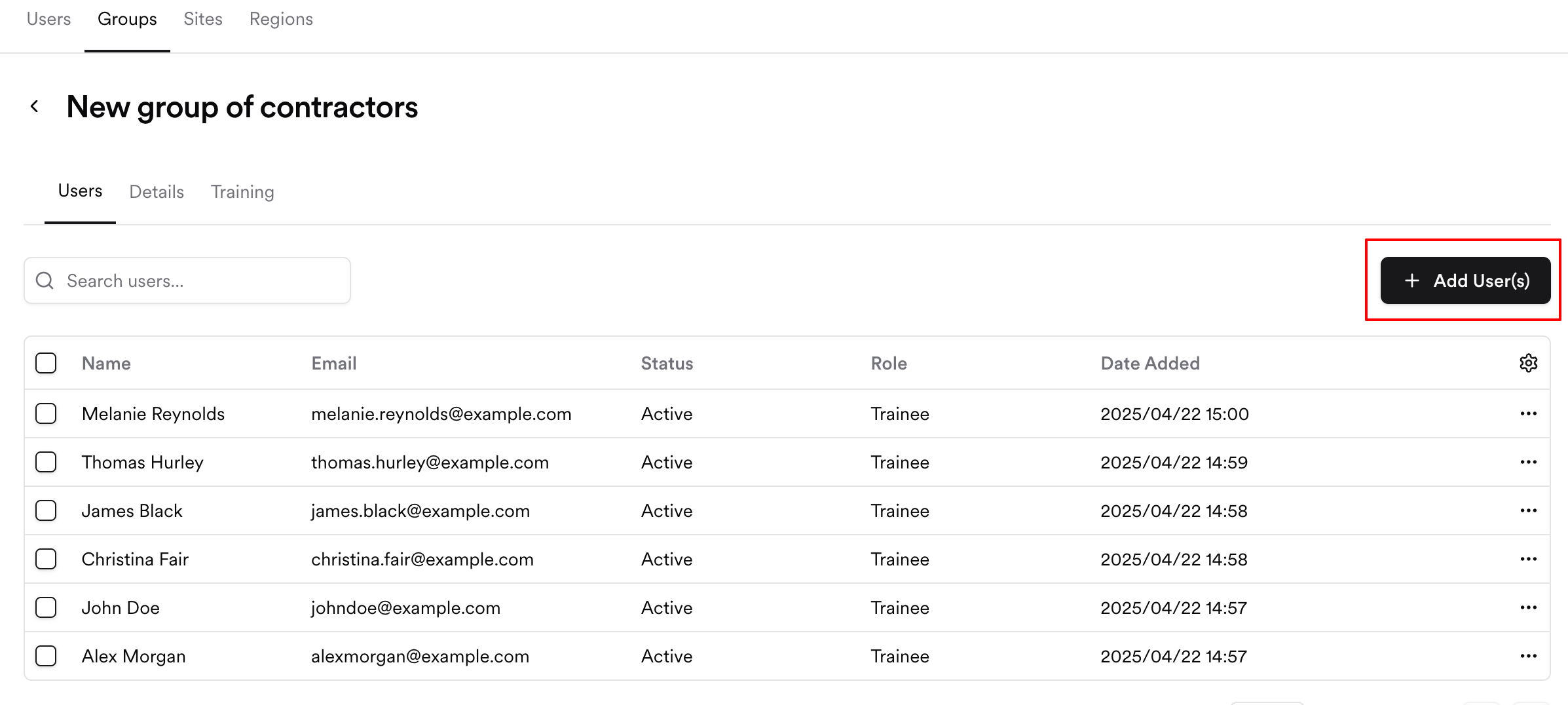 To add more users to the Group/Site/Region, click the 'Add User(s)' button and repeat the process.