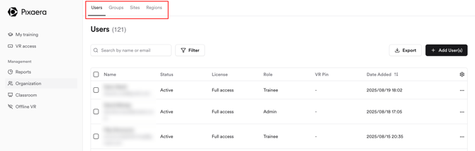 In Pixaera, it is possible to create groups, sites and regions, and add users to their respective locations or departments depending on how you would like to set it up.
